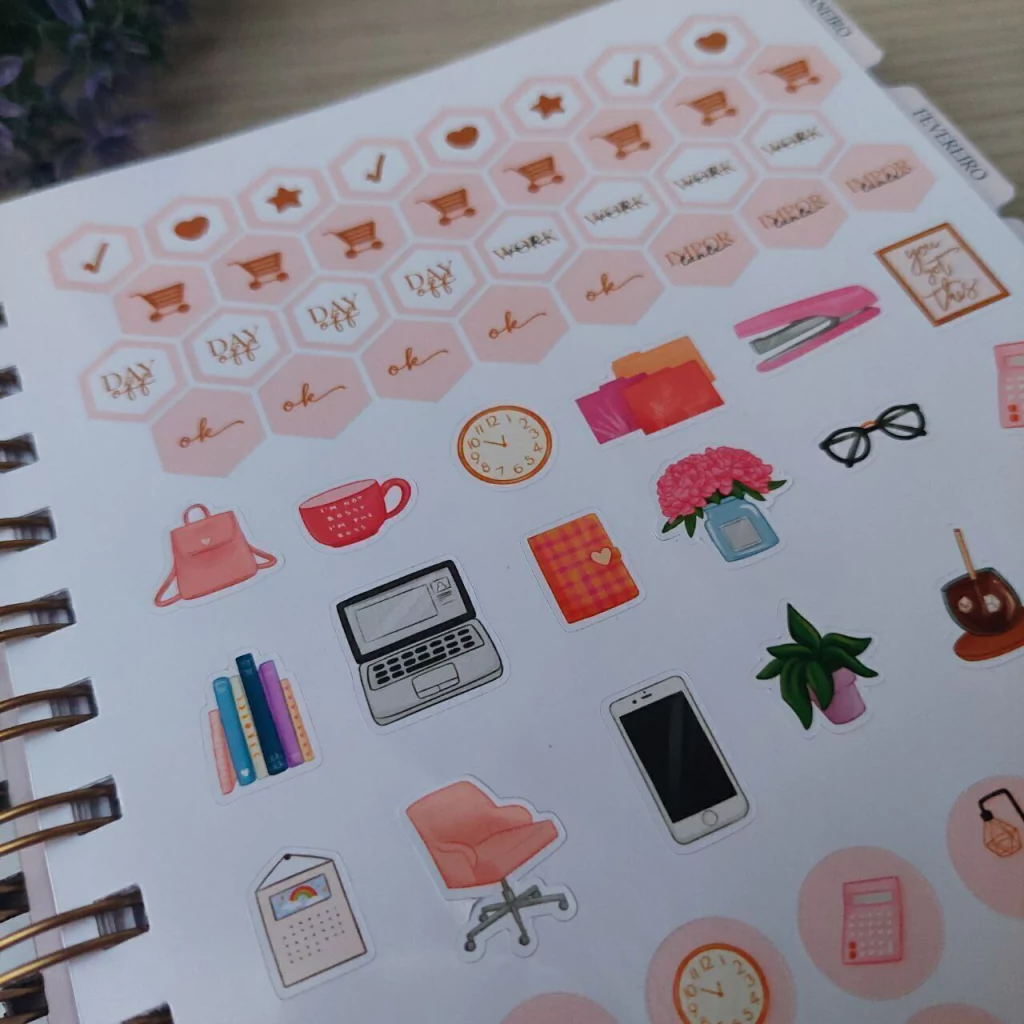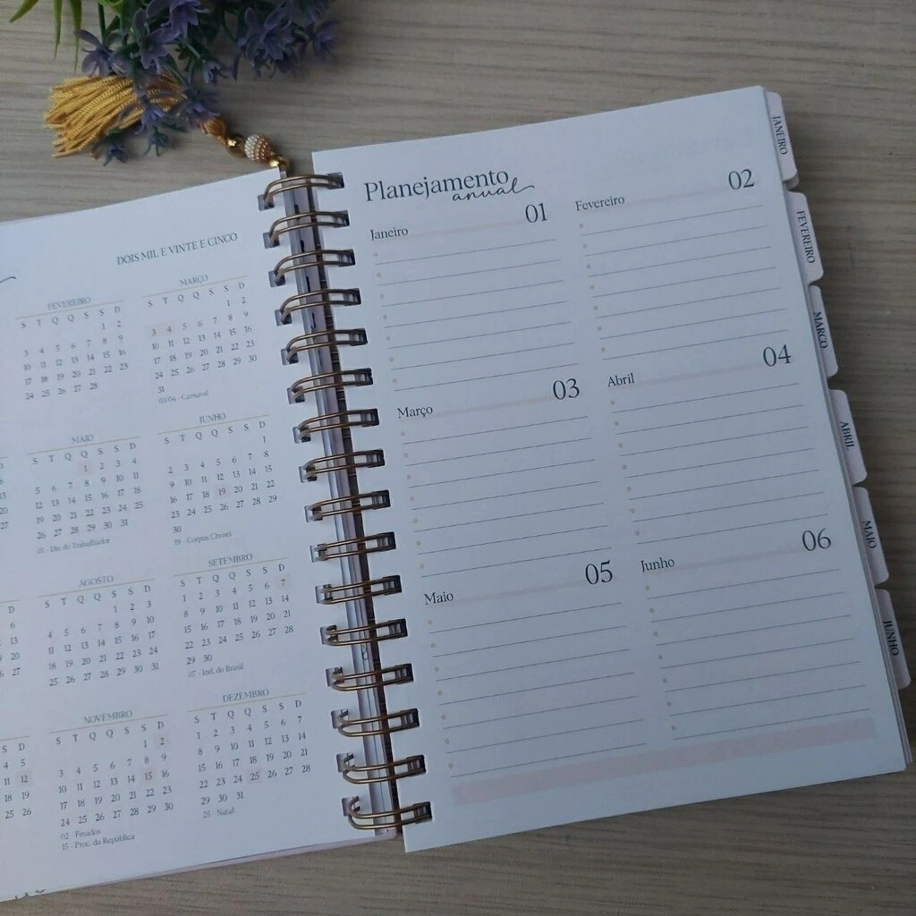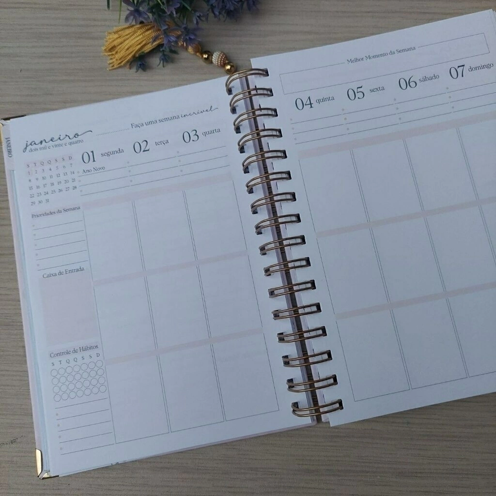 Todos os meses possuem: Planejamento diário dividido em três partes para que você utilize como melhor se adaptar a sua vida (manhã, tarde, noite ou vida pessoal, profissional e acadêmica, por exemplo). O planejamento semanal é de segunda a domingo em duas páginas. Visão completa da semana.