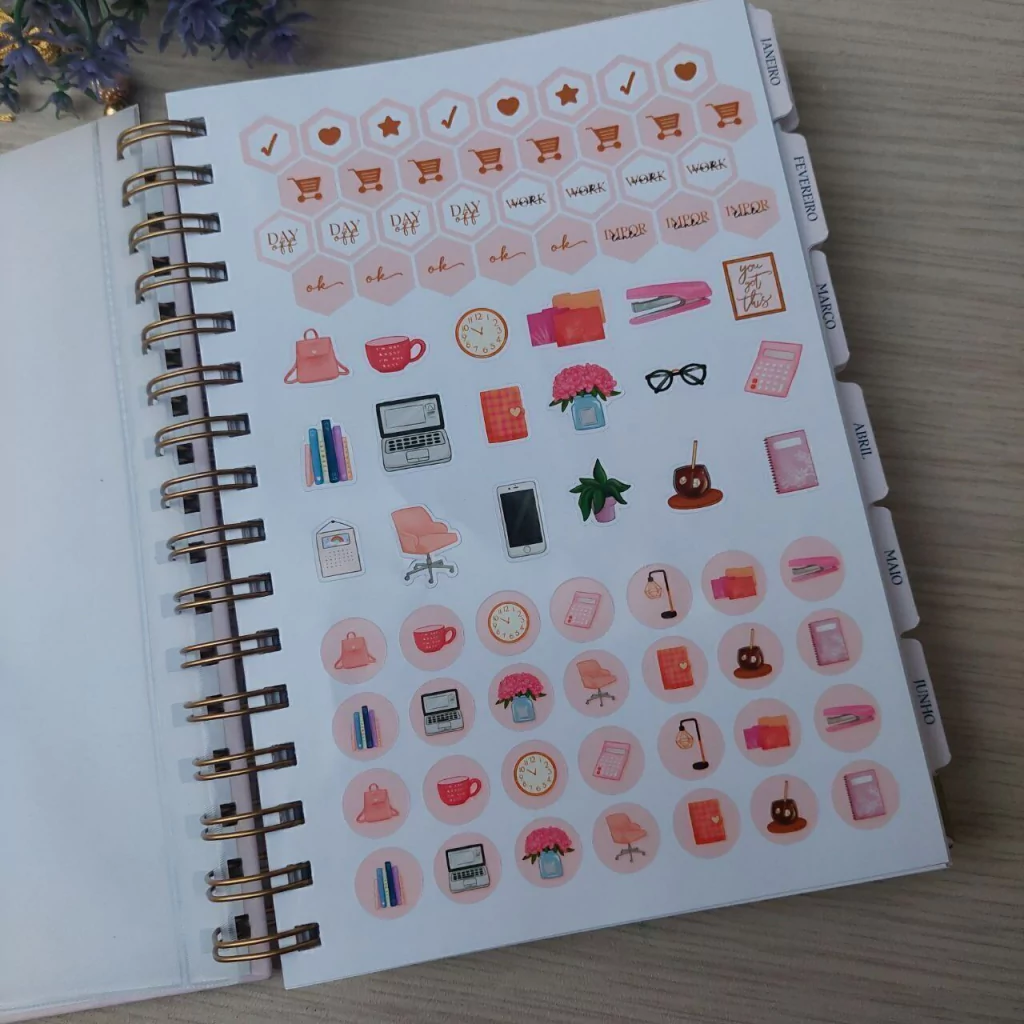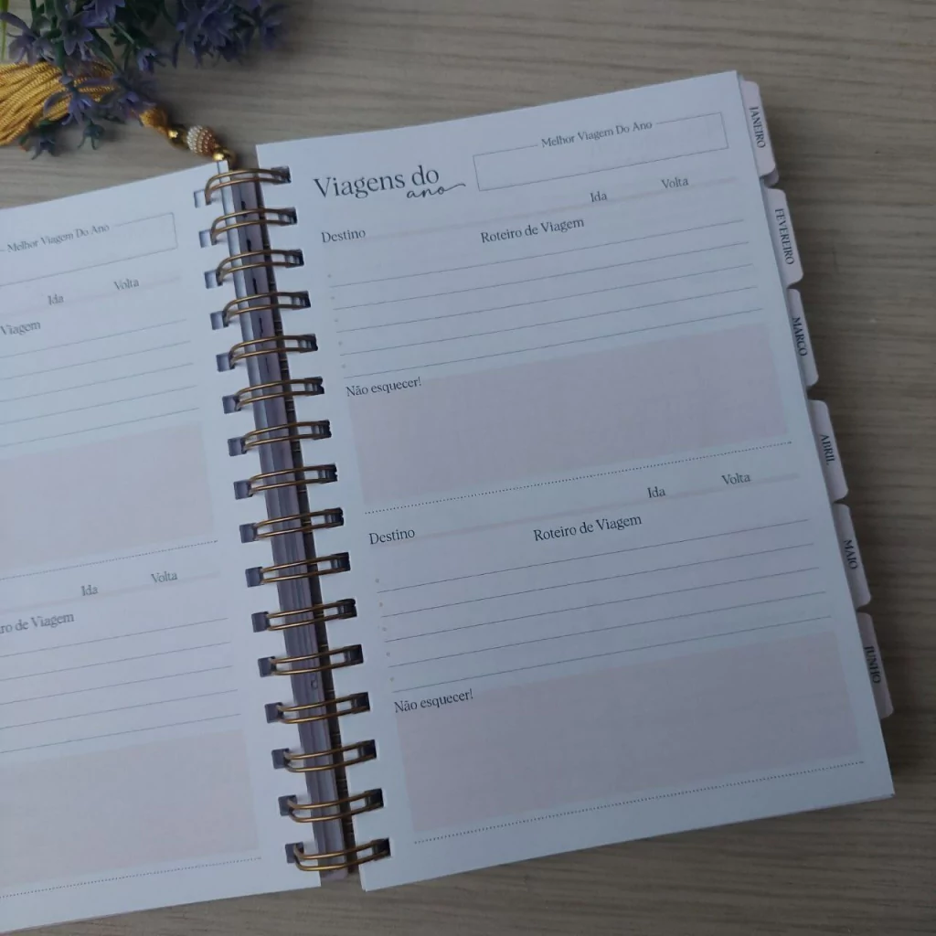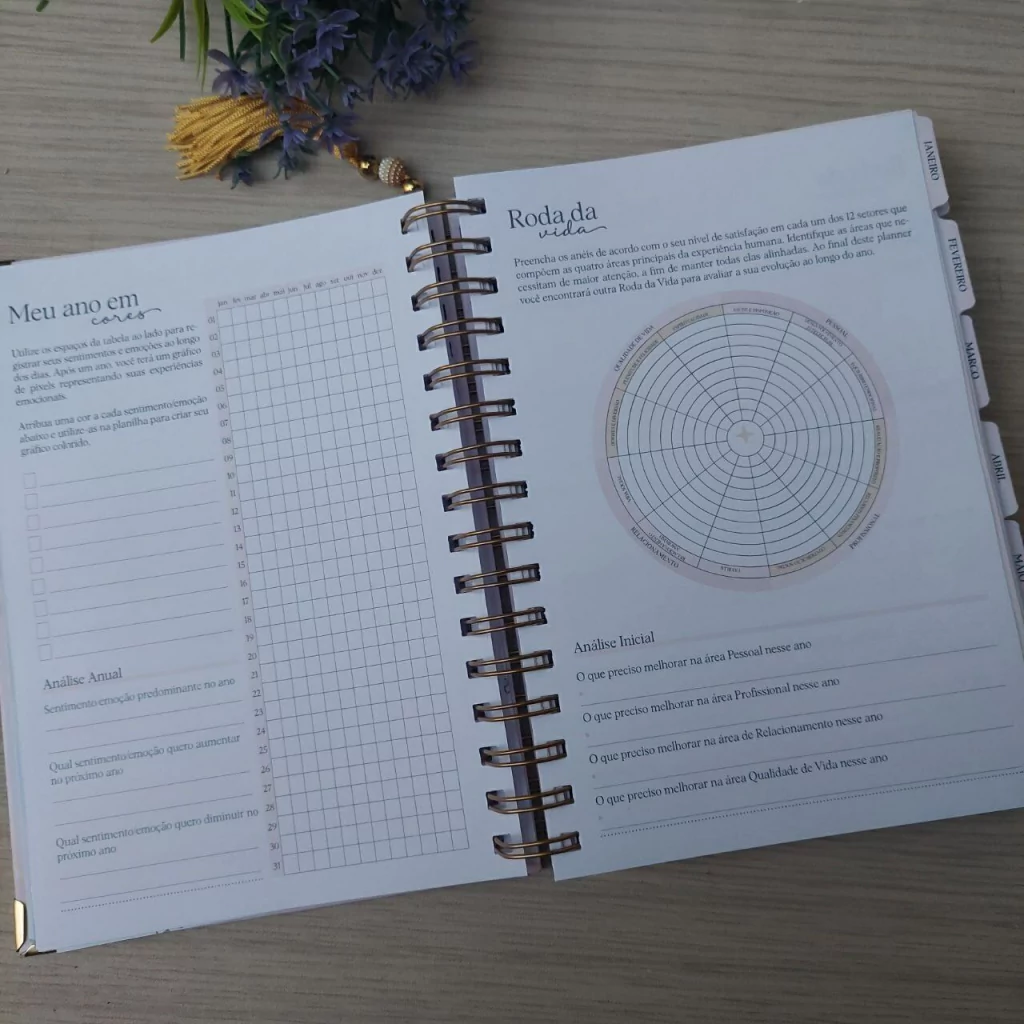 Todos os meses possuem: Planejamento diário dividido em três partes para que você utilize como melhor se adaptar a sua vida (manhã, tarde, noite ou vida pessoal, profissional e acadêmica, por exemplo). O planejamento semanal é de segunda a domingo em duas páginas. Visão completa da semana.
