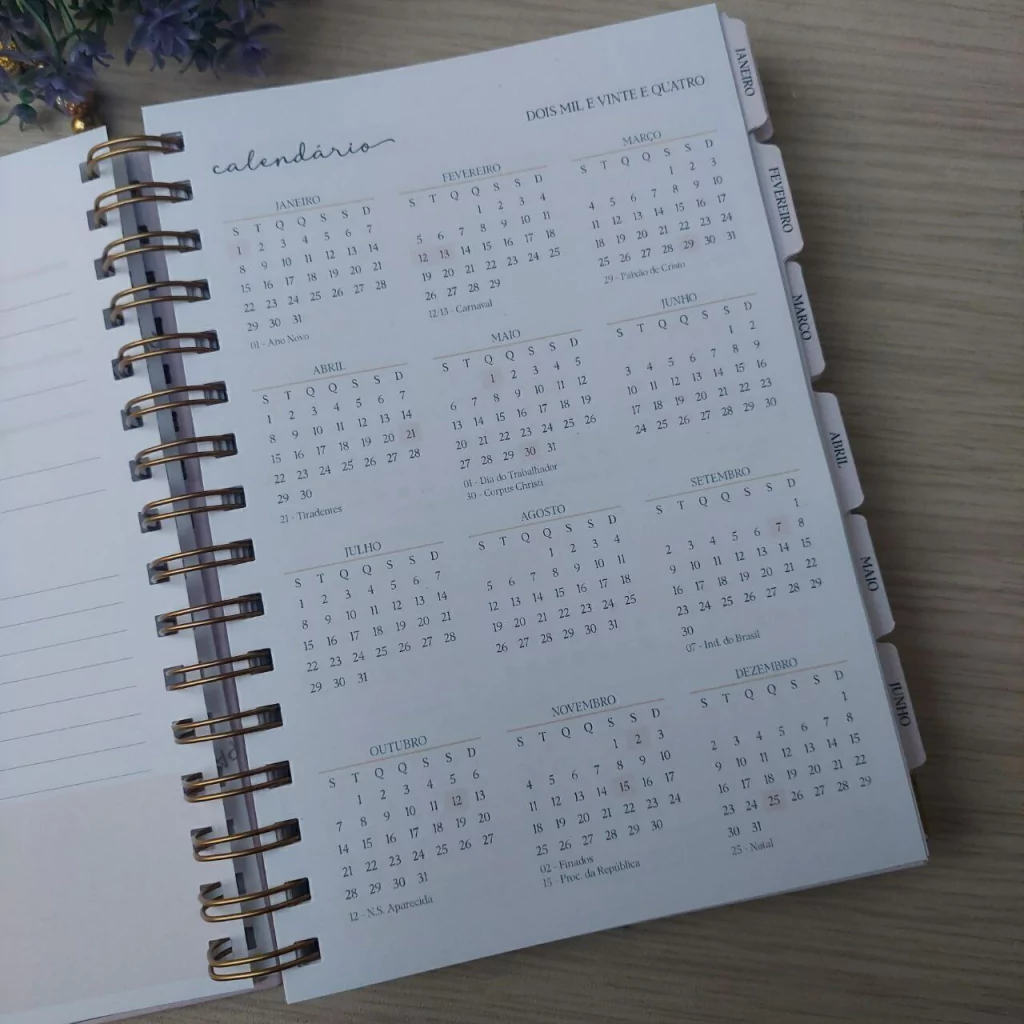 Todos os meses possuem: Planejamento diário dividido em três partes para que você utilize como melhor se adaptar a sua vida (manhã, tarde, noite ou vida pessoal, profissional e acadêmica, por exemplo). O planejamento semanal é de segunda a domingo em duas páginas. Visão completa da semana.